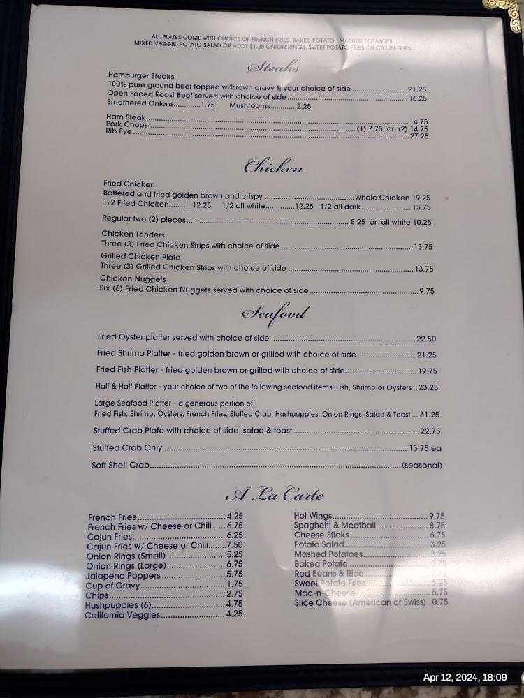 Enjoy specials on certain days, like shrimp stew on Fridays. The diverse menu presents something for everyone. Vegan and vegetarian options exist; ask for details. Prices are family-friendly, ranging between $10 to $20. The dessert selections bring a sweet finish to any meal, so save some room!